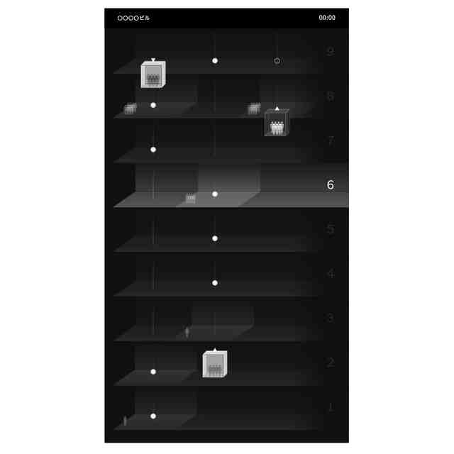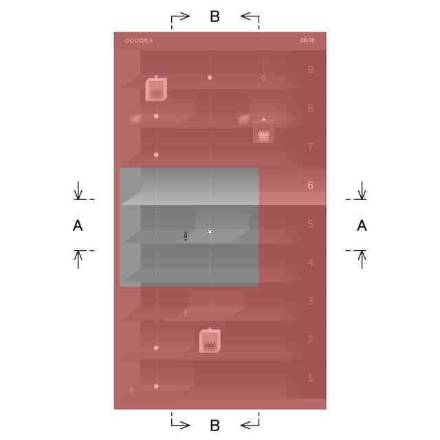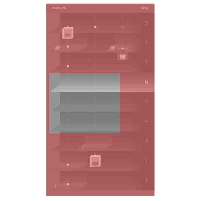 本画像は、エレベーターの運行情報を表示するための画像であり、各階に設置されるモニターに表示される。モニターを見ているフロア(現在階)がハイライトで表現され、エレベーターを待つ人がいる場合は、人物アイコンが表示されるとともに、そのフロアも部分的にハイライトで表現される。また、上下方向の縦線上にある丸アイコンはエレベーターの停止階を示している。