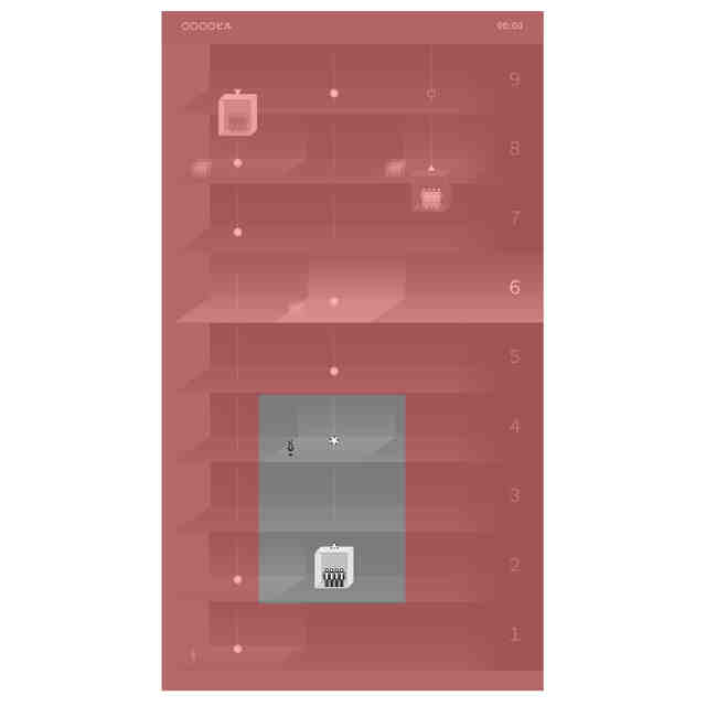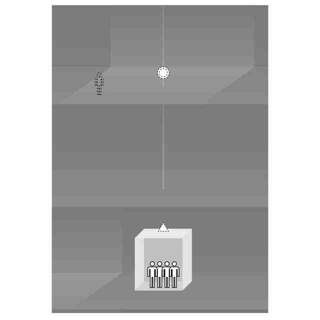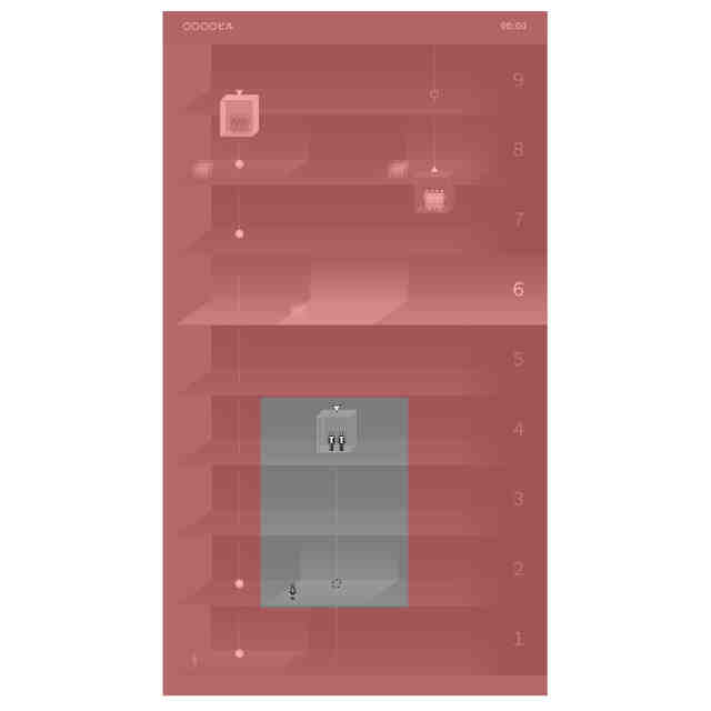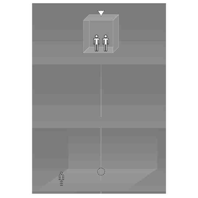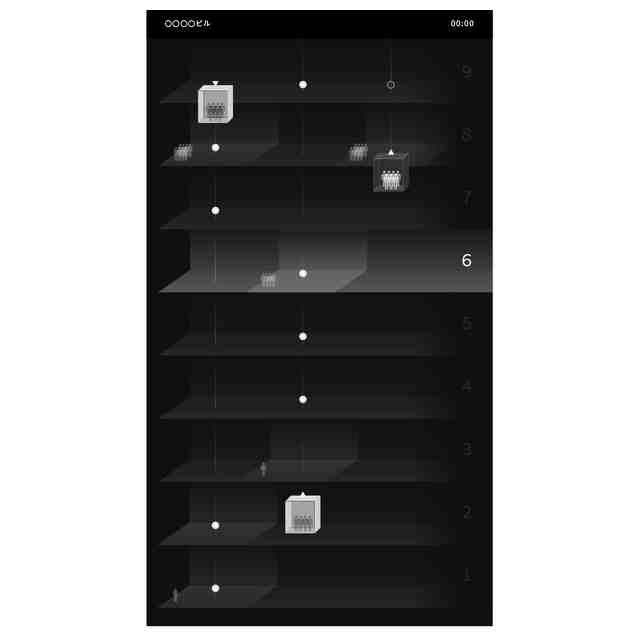 本画像は、エレベーターの運行情報を表示するための画像であり、各階に設置されるモニターに表示される。エレベーターを待つ人がいる場合は、人物アイコンが表示されるとともに、そのフロアが部分的にハイライトで表現される。また、上下方向の縦線上にある丸アイコンはエレベーターの停止階を示している。エレベーターのかご部は、乗客人数が表示され、現在階に向かっている場合には白色で、現在階から離れていく場合には黒色で表現されるとともに、上部には行先方向を示すマークが表示される。