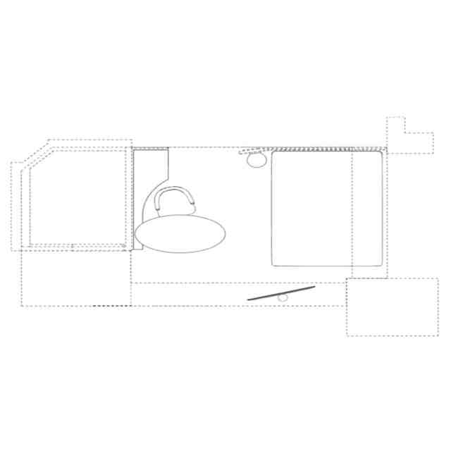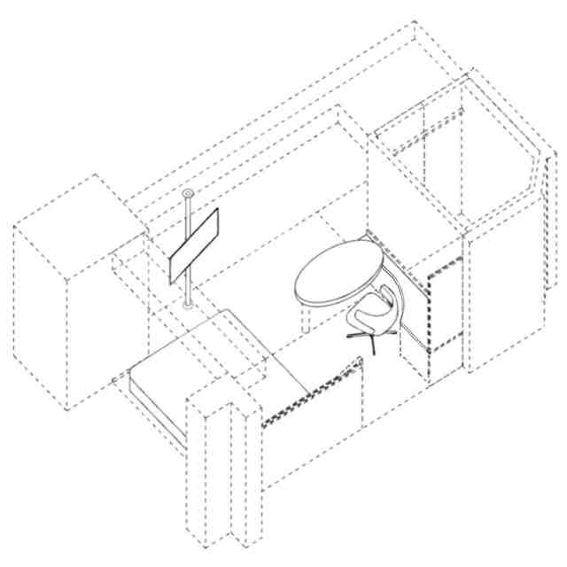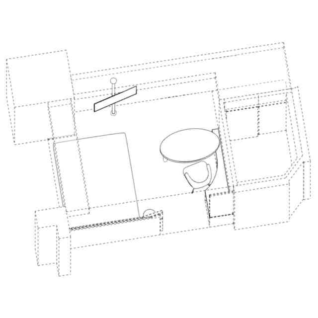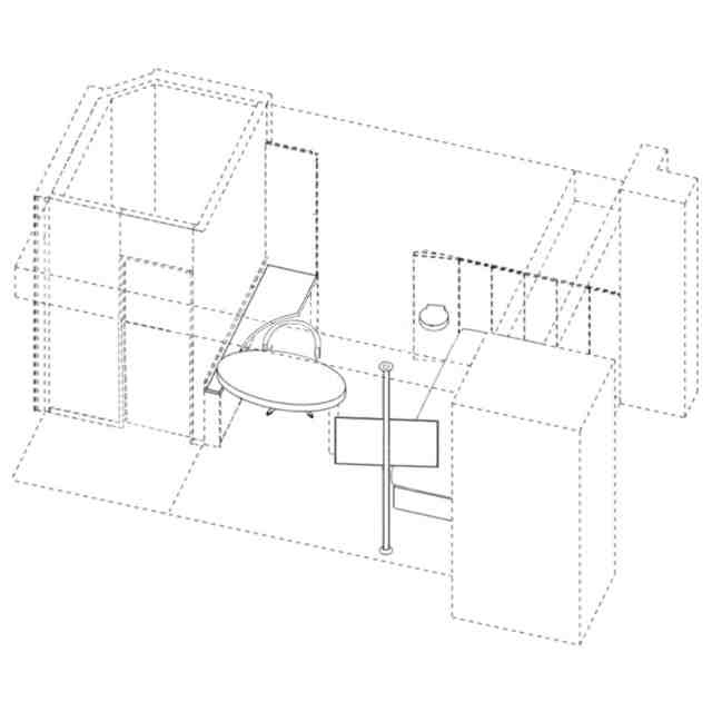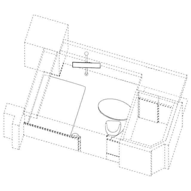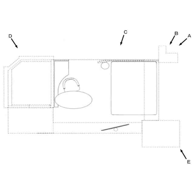 実線で表された部分が意匠登録を受けようとする部分である。A~Eの各斜め上方からの透視図は、A~Eの各方向を示す参考平面図中に示す矢印A~Eの各斜め上方向からそれぞれ部分的に透過して客室内装を示す斜視図である。