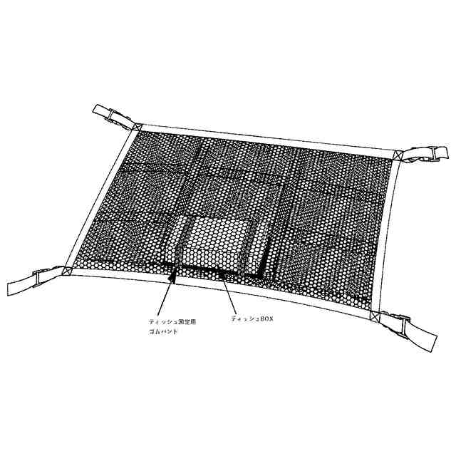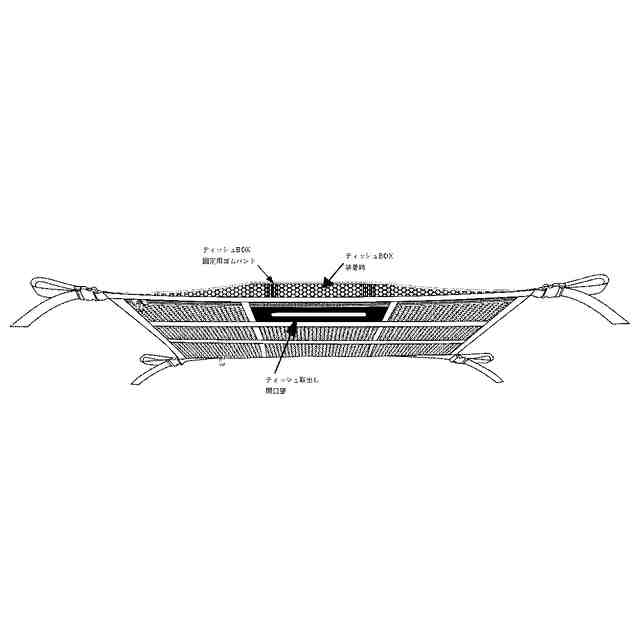 本意匠は、ネット部が上部、下部の2重になっている。下部ネットの一部にティッシュBOXを設置固定できるゴムバンドとティッシュ取出し用の開口部を備える。下部ネットのティッシュBOX開口部は、下部ネットと同一平面内にある。