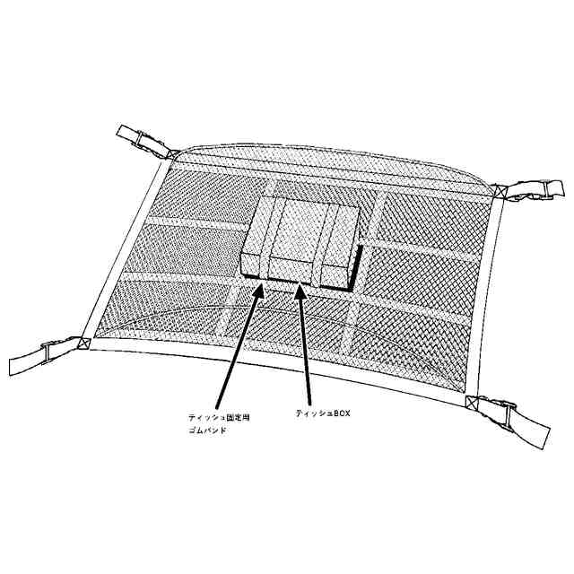本意匠は、ネット部が上部、下部の2重になっており、かつ上部のネットは立体構造で膨らみがあり、下部ネットは平面である。下部ネットの一部にティッシュBOXを設置固定できるゴムバンドとティッシュ取出し用の開口部を備える。下部ネットのティッシュBOX開口部は、下部ネットと同一平面内にある。