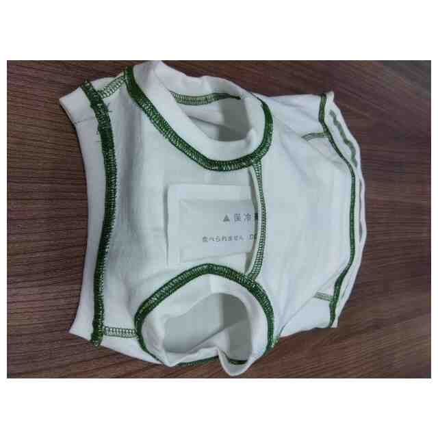 本物品は、主に犬等の四つ足の愛玩動物用の衣服として用いる。正面図における上部の穴から頭を通し、左右の穴から前足を通して着用して使用するものである。「ポケット部を示す参考図」に示す通り、着用時に衣服の内側となり愛玩動物の胸部にあたる部分にポケットが設けられている。ポケットには、ネームタグ、保冷材または消臭剤などを入れることが可能である。