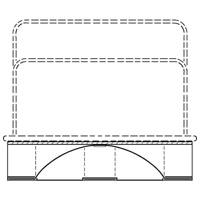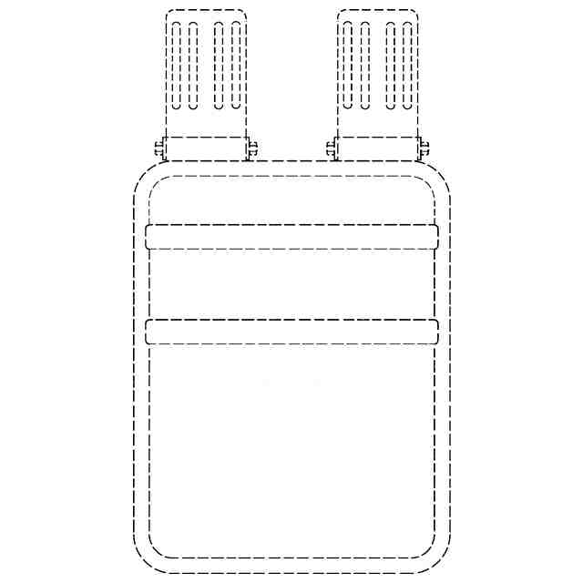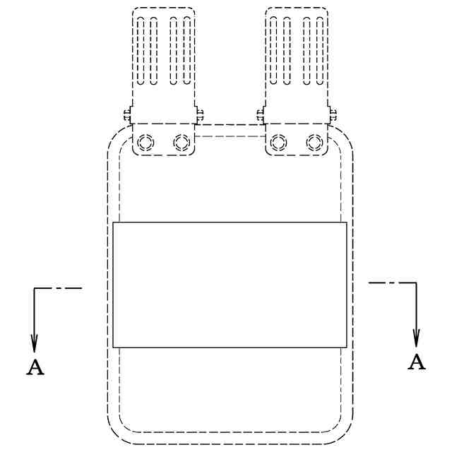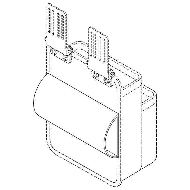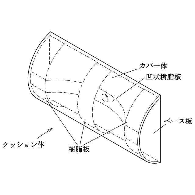 本物品は、「使用状態を示す参考図」に図示したように、作業者の腰ベルトに連結して使用する工具収納用腰袋であって、本体背面には、腰袋の背側や底縁が臀部や腿に当たる衝撃を緩和するため、弾性変形するクッション体が設けられている。また、クッション体は、「B-C-D部分参考拡大斜視図1」,「B-C-D部分参考拡大斜視図2」及び「B-C-D部分参考拡大分解図」に示すように、カバー体とベース板で構成された可撓性を有する蒲鉾形状体であり、内部に弾性変形する樹脂板が設けられている。尚、凹状樹脂板は両端の樹脂板を支持し、3つの樹脂板はカバー体を支持する部材である。本物品のクッション体は、幅約19cm,上下長さ約10cm,高さ約4cmである。