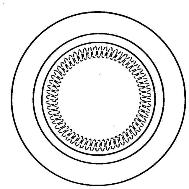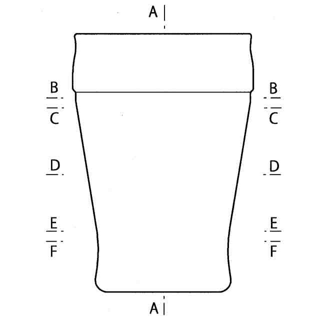 各図で、実線部分が意匠登録を受けようとする部分であり、破線部分は意匠登録を受けようとする部分以外の部分を表す。本物品の内面の形状は、C-C端面図の高さ位置からB-B端面の高さ位置に向けて、略多角形の略多面体から円形の曲面にぼかして形成され、また、E-E端面図の高さ位置からF-F端面の高さ位置に向けて、略多角形状の略多面体から円形の曲面にぼかして形成されている。