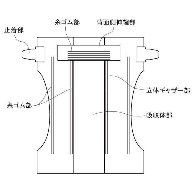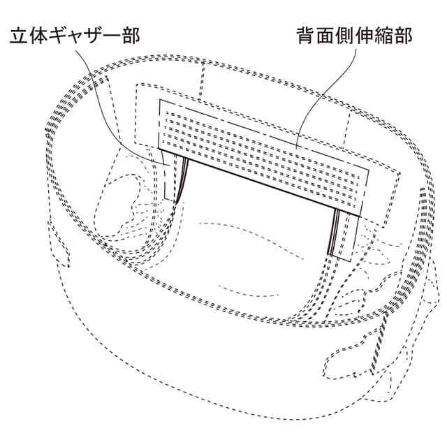 本物品は、背面側伸縮部及び立体ギャザー部を備えた使い捨ておむつである。「各部名称を示す参考H-H部分拡大図」に示すように、本物品の背面側伸縮部及び立体ギャザー部は接着部により接着されているため、「着用状態にあるときの拡大斜視図」や「E-E部分のF-F拡大断面図」、「E-E部分のG-G拡大断面図」等に示すように、着用状態において背面側伸縮部及び立体ギャザー部が連動して一体的に立ち上がる。これにより、「使用状態を示す参考断面図」に示すように、背面側伸縮部の下方に排泄物等を収容するための空間部が形成される。