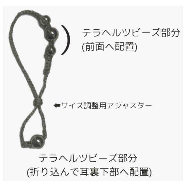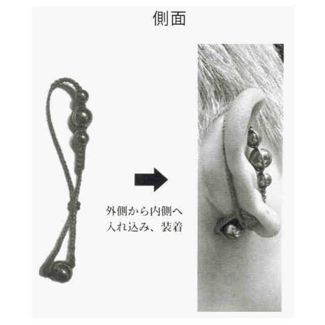 本物品は、耳につけて使用するアクセサリーであり、耳介のツボ、裏側にあるツボ(※別紙参照)の4箇所へテラヘルツ鉱石が当たるよう設計。直接押すことで、美容、健康、リフトアップ、成人病予防にアプローチできる他、微弱刺激を与えながらアクセサリーとして日常使いができるアイテムである。
