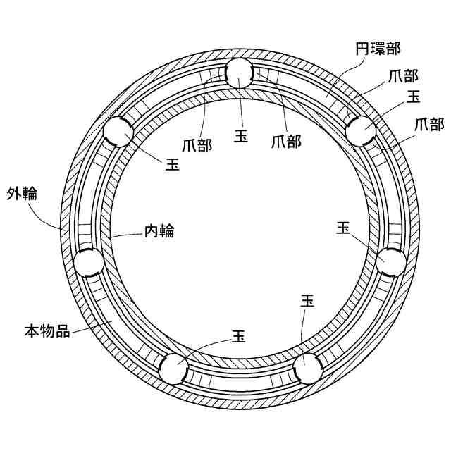 本物品は、玉軸受の保持器である。本物品は、使用状態を示す参考図のように、円環部と、その円環部から軸方向に延びる複数対の爪部とを有する。複数対の爪部は、外輪と内輪の間に配置される複数の玉を保持する。