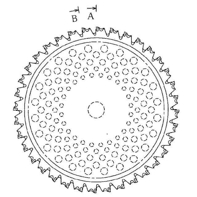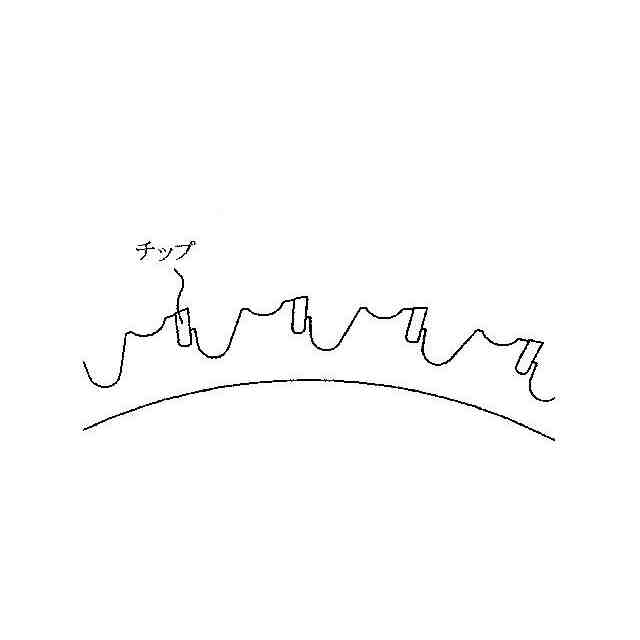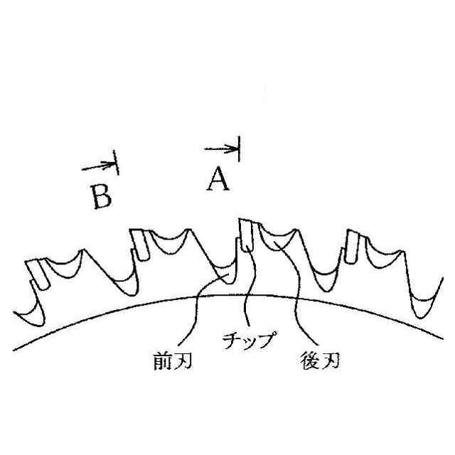 本物品は、刈払機に装着して使用するチップソーであり、刃部の形状に特徴を有している。円板状台座の正面側の外周縁には、全周に亘り多数の刃部が設けられており、チップの前溝には前刃が、チップの後部には後刃が形成された3段刃となっている。