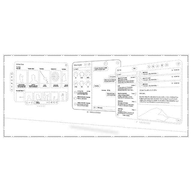 破線で表された部分以外の部分が、意匠登録を受けようとする部分である。一点鎖線は、意匠登録を受けようとする部分とその他の部分との境界のみを示す線である。参考画像図において青色で着色された部分は、例えば3次元仮想空間や3次元現実空間を示す画像等がユーザーの視野内の背景コンテンツとして表示される部分である。参考画像図において赤色で着色された部分は、例えば写真やメディア情報等のコンテンツが表示される部分である。参考画像図において青色で着色された部分以外の部分は、3次元に見える部分である。