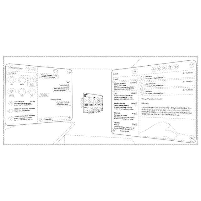 実線で表された部分が、意匠登録を受けようとする部分である。一点鎖線は、意匠登録を受けようとする部分とその他の部分との境界のみを示す線である。参考画像図において青色で着色された部分は、例えば3次元仮想空間や3次元現実空間を示す画像等がユーザーの視野内の背景コンテンツとして表示される部分である。参考画像図において赤色で着色された部分は、例えば写真やメディア情報等のコンテンツが表示される部分である。参考画像図において青色で着色された部分以外の部分は、3次元に見える部分である。
