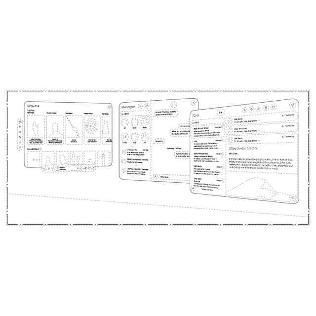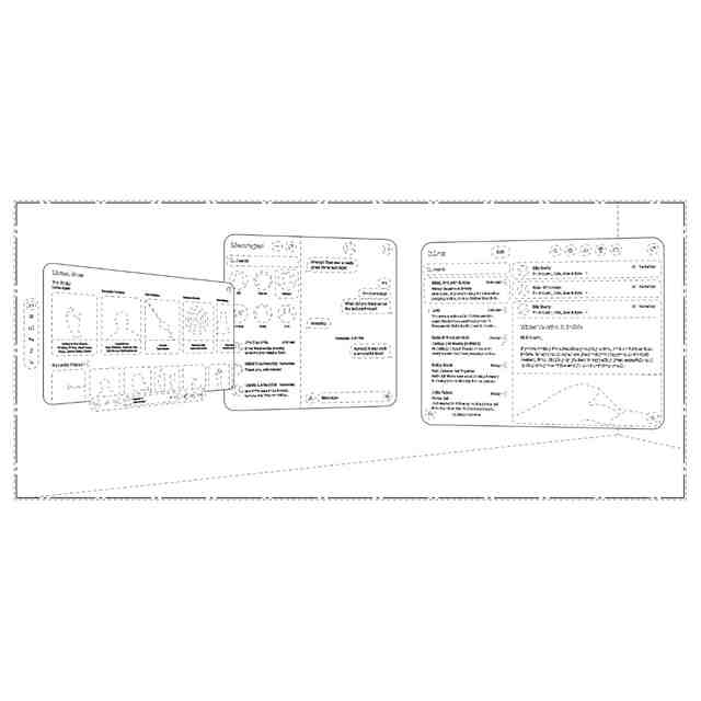 本願意匠に係る画像「情報表示用画像」は、例えばウェブサイトやコンテンツ、検索結果、コミュニケーション等に関する情報を表示するための画像であり、仮想現実空間や拡張現実空間等の3次元に見える空間内で用いられる。本画像は、見る者の視点の変化に応じて、「画像図」から「変化した状態を示す画像図」までに示すように、画像が変化する。