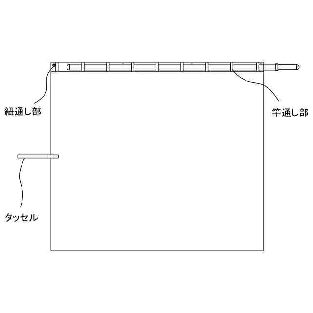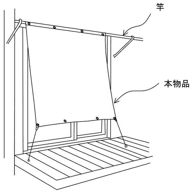 本物品は、使用状態を示す参考図に示すように、ベランダ等の屋外に主に日除けとして使用されるものである。上方には、紐通し部と竿通し部の両方が設けられており、紐を利用して設置したり、洗濯物を干すための竿等を挿入して設置することもできる。不使用時には、タッセルを使用してカーテンを閉じることもできる。