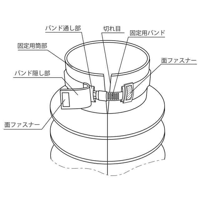 本願意匠に係る物品は、油圧シリンダを保護するためのシリンダ保護カバーである。シリンダ保護カバーは、参考図に示す切れ目を開いて油圧シリンダに取り付け可能な中空状であり、取り付けの際に切れ目が面ファスナー等によって留められるようになっている。 シリンダ保護カバーは、固定用筒部と、バンド通し部と、バンド隠し部とを有する。固定用筒部は、蛇腹部の端部に設けられている。バンド通し部は、固定用筒部に設けられている。固定用筒部は、バンド通し部に挿入された固定用バンドにより、油圧シリンダの端部に固定される。バンド隠し部は、固定用筒部に設けられ、バンド通し部から突出した固定用バンドを覆い隠す。