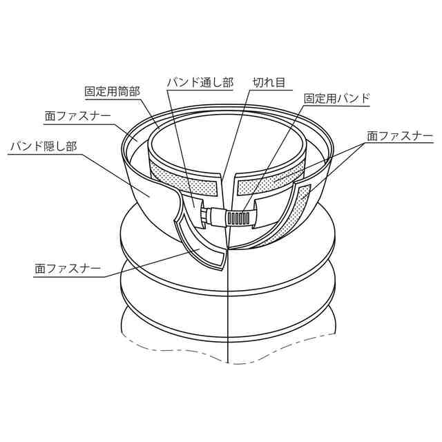 本願意匠に係る物品は、油圧シリンダを保護するためのシリンダ保護カバーである。シリンダ保護カバーは、参考図に示す切れ目を開いて油圧シリンダに取り付け可能な中空状であり、取り付けの際に切れ目が面ファスナー等によって留められるようになっている。 シリンダ保護カバーは、固定用筒部と、バンド通し部と、バンド隠し部とを有する。固定用筒部は、蛇腹部の端部に設けられている。バンド通し部は、固定用筒部に設けられている。固定用筒部は、バンド通し部に挿入された固定用バンドにより、油圧シリンダの端部に固定される。バンド隠し部は、固定用筒部の外周面を覆い、バンド通し部から突出した固定用バンドを覆い隠す。