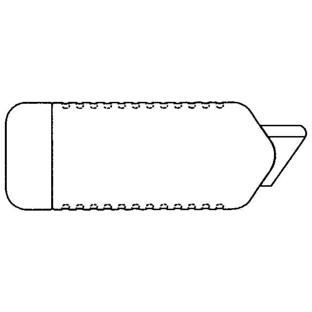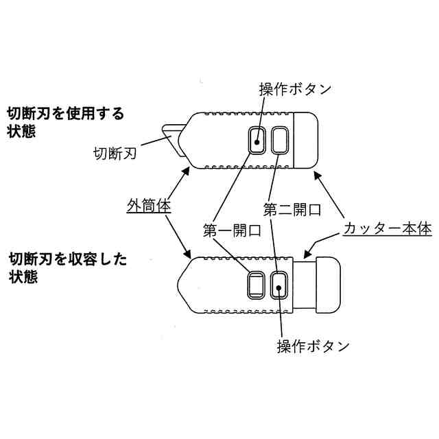実線部分が部分意匠として意匠登録を受けようとする部分であり、破線部分はそれ以外の部分を表す。「各部を説明する参考図」のように、本物品は先端に切断刃(セラミックス製等からなる)を設けたカッター本体と、カッター本体の外周に位置して軸方向に移動できる外筒体とからなる。また、カッター本体の外面に、突出側に付勢した操作ボタンを備える。また、外枠体には操作ボタンを係止できる第一開口と第二開口とを備える。また、操作ボタンが第一開口に係止して、外筒体とカッター本体の相対位置を維持して、切断刃が外筒体より突出し、切断刃を使用できる。また、第一開口に位置している操作ボタンを押して係止を解除すると、操作ボタンが第二開口に自動的に移動し、かつ操作ボタンが第二開口に係止して、切断刃を外筒体内に収容して、この相対位置を維持して安全に本物品を取り扱うことができる。また、再度操作ボタンを第一開口に移動させれば、切断刃を使用する状態に戻すことができる。