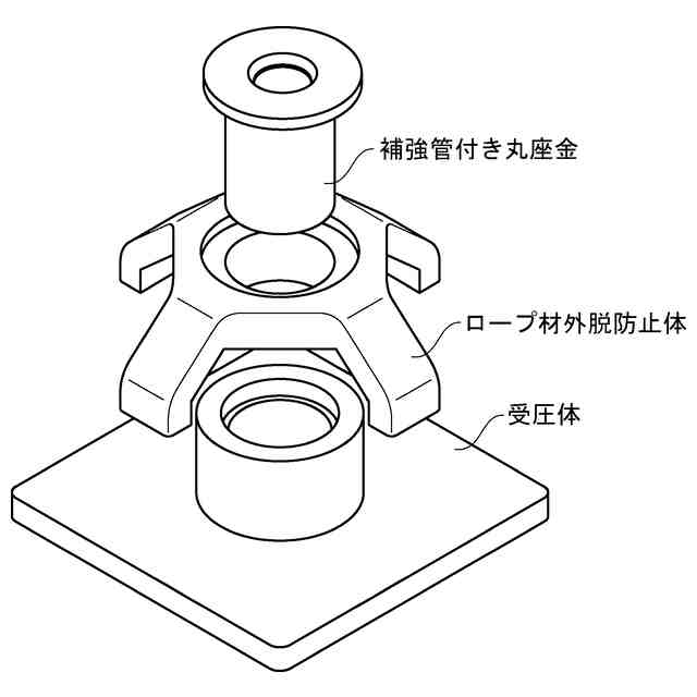 本物品は、斜面の表層崩壊の防止を目的として、斜面に格子状に配したワイヤロープ等のロープ材の交点に設置して使用する支圧板である。補強管付き丸座金、ロープ材外脱防止体、受圧体により構成される。ロープ材の交点に打設したロックボルトに本物品を取り付け、受圧体にロープ材を巻き掛けて使用する。ロープ材外脱防止体と受圧体は樹脂素材より成り、ロープ材の接触による電蝕の防止と、本物品の軽量化を図っている。