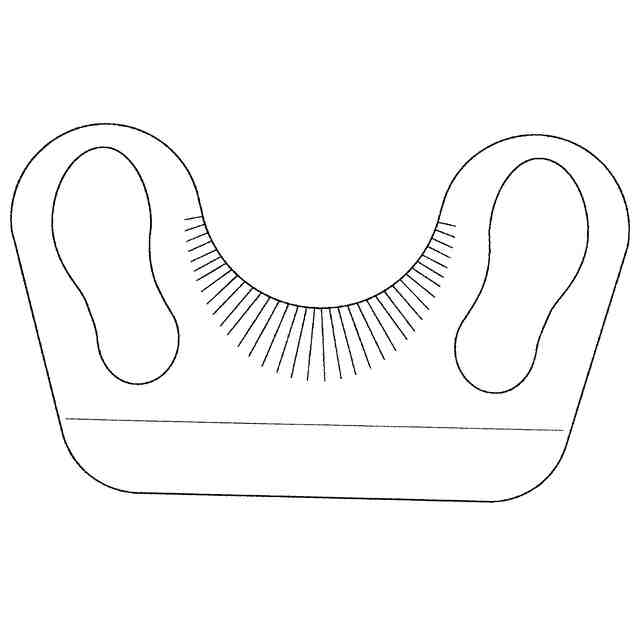 男子排尿のさいの小用便器鉢外側への尿の飛び散り、漏れ、垂れを原因とする悪臭・汚染防御を促す、足型立ち位置表示のゴム製トイレ・マットで、立ち位置を可視化することにより”一歩前へ“を的確に訴える意匠です。 同マットの形態は、厚さ5~7ミリメートルとして便器底部前面周辺を約30センチメートルで囲み、いかなる便器形態にも対応できるよう、マット凹部に幅1センチメートルほどの切り込みを設けます。足型の長さは28センチメートル程度として便器中央に爪先が当たる位置に設けます。正面図下部先端は躓き防止のため傾斜面を設けます。ゴムマットは水洗浄に耐えますが、抗菌・除臭のある材質があれば最適とします。