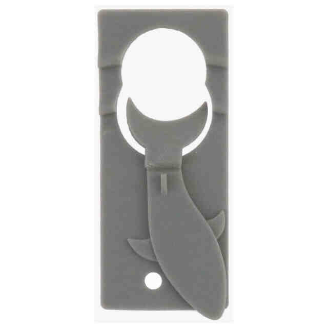 本願意匠に係る物品は、平面長方形状に形成された本体に設けられた穴にペットボトルのネック部を装着し可動板を当接することでペットボトルを固定し吊り下げ携帯することを特徴とするペットボトルホルダーと、ペットボトルホルダーとして使用しない時は可動板を利用してスマートフォンなどを立てて視聴できるスタンド機能を有したものである。「参考斜視図1」 ペットボトルの装着方法は「本体」一方側にペットボトルのキャップおよびネックが通る開口部「挿入穴」がありボトルネックを「本体」裏側より挿入する。「参考斜視図2」「挿入穴」より中心をずらした長方形短辺近傍側にネック部径に合わせたやや小さい開口部「固定穴」が連続して設けられており、ボトルネックを挿入したまま横に移動させるとボトルネックの径に適合してボトルを固定できる。「参考斜視図3」 また、「固定穴」から見た「挿入穴」の逆端側に本体側とヒンジ部でつながり、キャップの径に合わせた径で切られた半月型の「固定用可動板」が設置されていて、これを倒してボトルキャップ側面に支持させることでボトルネックが「固定穴」から外れて脱落するのを防ぐ。「固定用可動板」は「挿入穴」縁の本体面に当たると止まり裏側に回転しない。「参考斜視図4」 「固定用可動板」がヒンジでつながっている形状は海洋生物の胴体とヒレに見えるような意匠が特徴である。「本体」上のボトルを係止する側の逆の短辺に吊り下げに使用する「金具係止穴」が設けてあり、腰ベルトやリュックサックからペットボトルを吊り下げて携帯することができる。ボトルの係止面は本体面に対し角度がついており、吊り下げたボトルが上を向くように配慮してある。「参考斜視図5」 スマートフォン等のスタンド利用方法は、本体を机などの上に平らに置き「固定用可動板」を持ち上げ、「止め板」に当たるまで回転させる。「参考斜視図6」「固定用可動板」をスマートフォンの裏側に支持させる。「参考斜視図7」本体ボトル係止部の端部に凸状の稜線「滑り止め」が設けてあり、スマートフォンの正面下側端部が滑らないよう固定し、斜めの角度を維持する。「滑り止め」は2本あり、スマートフォンの設置角度を変え、メディアの視聴およびカメラの撮影をすることができる。「参考斜視図8」