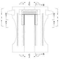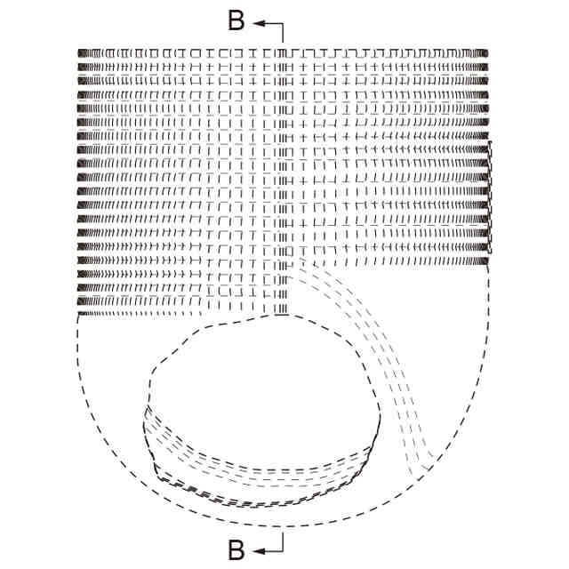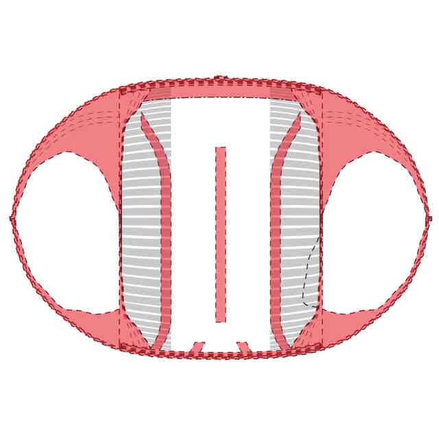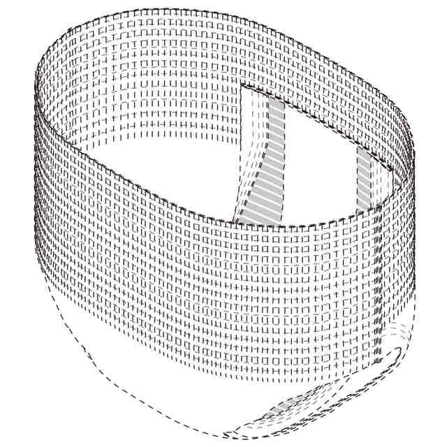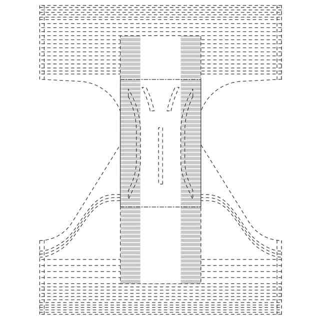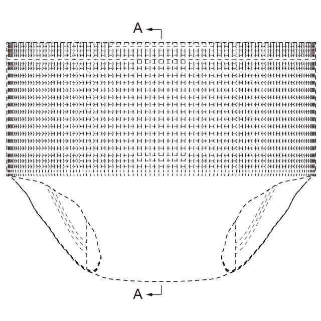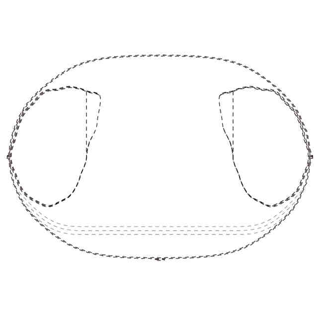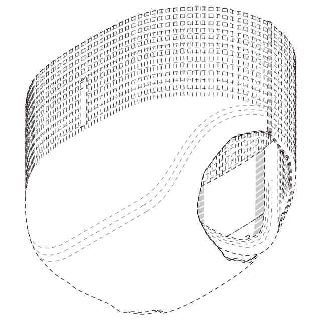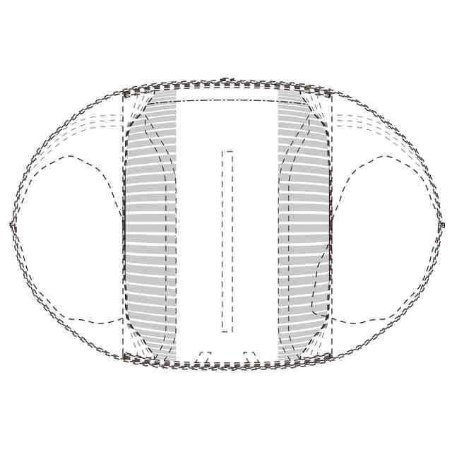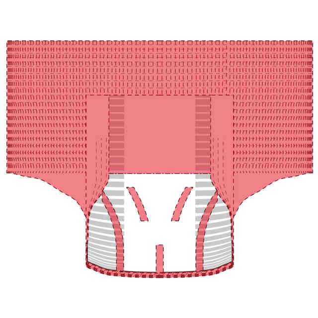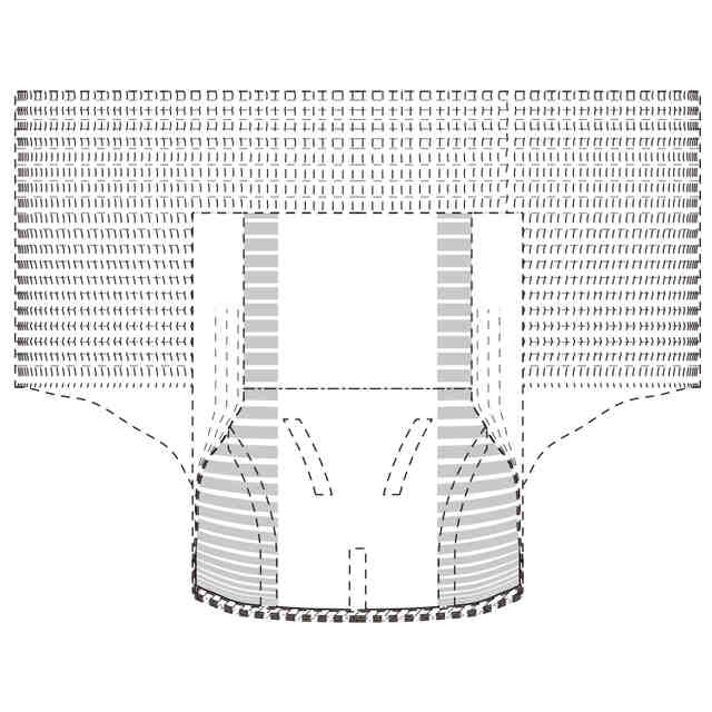 実線で表した部分が、部分意匠として意匠登録を受けようとする部分である。一点鎖線は部分意匠として意匠登録を受けようとする部分とその他の部分との境界のみを示す線である。「意匠登録を受けようとする部分を示す参考平面図」及び「意匠登録を受けようとする部分を示す参考B-B断面図」において、赤色で着色を施した部分以外の部分が、部分意匠として意匠登録を受けようとする部分である。「サイド係止部を破断して展開した状態の参考縮小背面図」は、ギャザー部を省略して表した状態である。