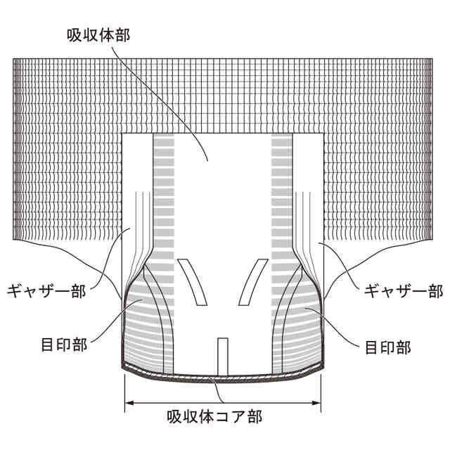 本物品は、「各部名称を示す参考B-B断面図」に示すように、排出された液体を吸収する吸収体コア部を、吸収体部内の端部まで備えた使い捨ておむつである。この構成により、着用者の足回りに隙間が生じることが低減されるため、排出された液体が漏れることを抑制できる。また、本物品は、吸収体部の肌側面の両端部に、目印部が表れている。この目印部により、吸収体コア部を端部まで備えた構成について、着用者に視覚的に伝達し、安心感を与えることができる。本物品は、主として薄い不織布で形成されるため、その性質上、全体に亘って皺が寄って表れることがある。