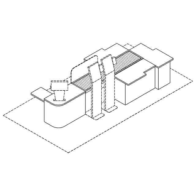 本物品は、平面視左方に設けたレジユニットと、搬送ユニットが直線に並び、搬送ユニットの右方周囲に複数の袋詰め作業台ユニットが配置されるものである。搬送ユニットはレジユニットの方向から袋詰め作業台ユニットの方向に品物を移動させるものである。