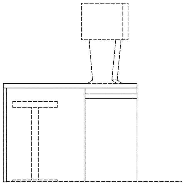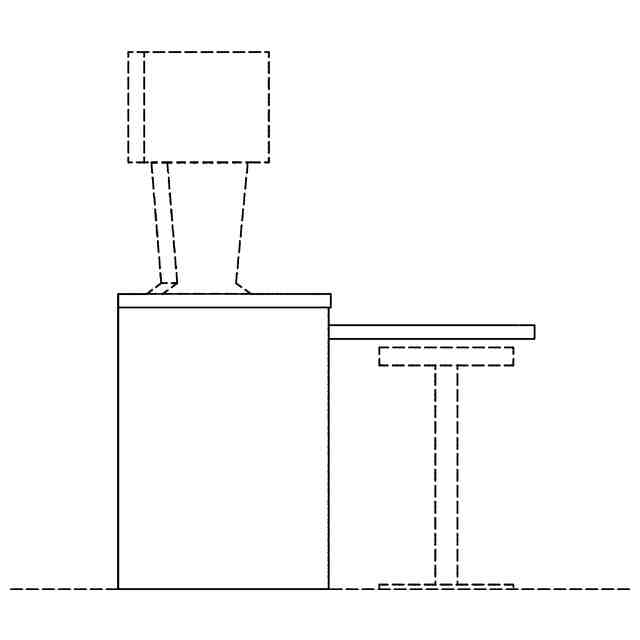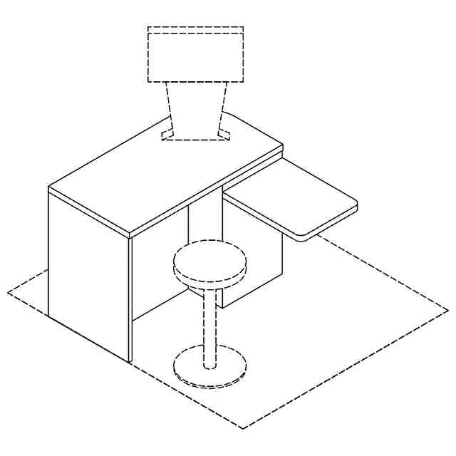 本物品は、平面視左右方向にのびた本体の天板を備え、本体の天板より低い位置に片持ちの第二の天板を有し、平面視で略L字型の配置である。本体の天板と第二の天板に囲われる空間には椅子を配置するものである。