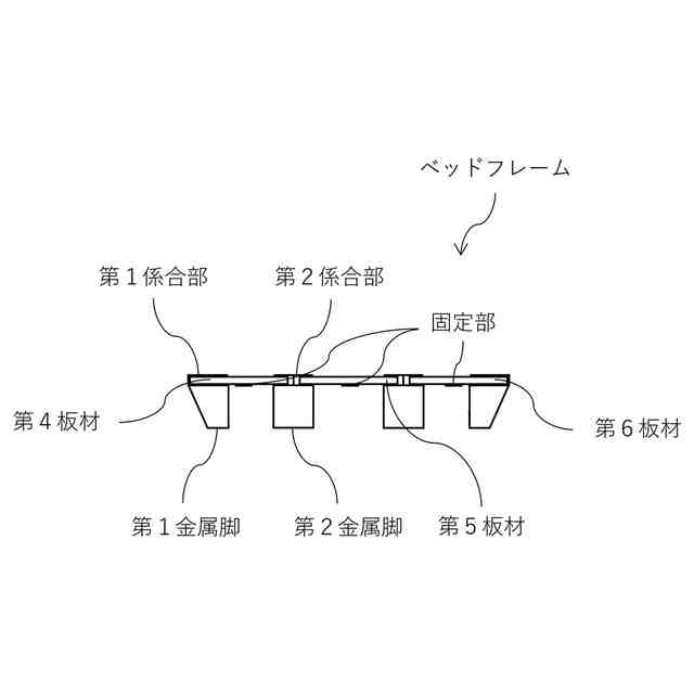 本物品は、使用者が容易に組み立てることができるベッドフレームである。より具体的には、複数枚の略長方形状の板材、第1金属脚、及び、第2金属脚を備えるベッドフレームであって、第1金属脚は、金属板を折り曲げて形成した貫通形状であり、最も左側に位置する板材(「各部の名称を示す参考図1」における第1板材又は第4板材)の左端部、又は、最も右側に位置する板材(「各部の名称を示す参考図1」における第3板材、又は、第6板材)の右端部と係合する第1係合部を有し、第2金属脚は、第1金属脚と同様に金属板を折り曲げて形成した貫通形状であり、最も左側に位置する板材、又は、最も右側に位置する板材と、その板材と板材の短手方向に隣接する板材(「各部の名称を示す参考図1」における第2板材、又は、第5板材)2枚と係合する第2係合部を有し、第1係合部は、板材の長手方向に隣接する板材(例えば「各部の名称を示す参考図1」における第1板材、及び、第4板材等)同士を跨ぐ位置、及び、板材の長手方向の開放端部近傍の位置において、ネジ等の締結部材により板材に固定され、第2係合部は、板材の長手方向に隣接する板材(例えば、「各部の名称を示す参考図1」における第1板材、及び、第4板材等)同士を跨ぐ位置、及び、板材の長手方向の開放端部近傍の位置において、ネジ等の締結部材により板材に固定される、ベッドフレームである。