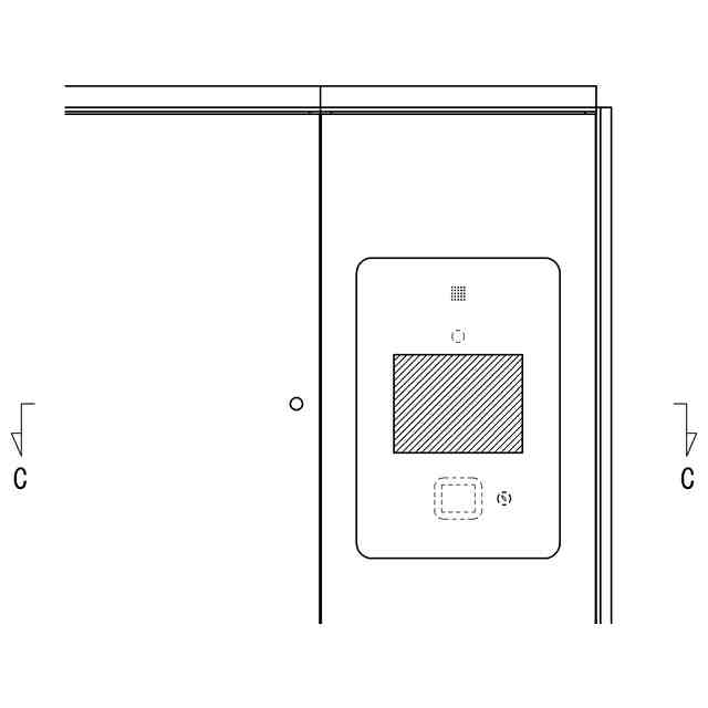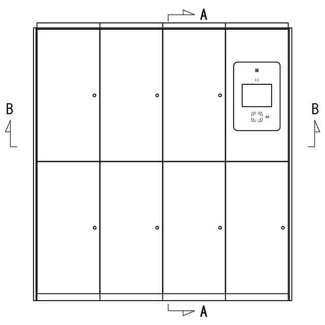 本物品は、正面視右上方の縦長矩形内に、タッチパネルモニターの表示画面と、QRコード読み取り機と、スピーカーを備えたものである。タッチパネルモニターとQRコード読み取り機によって認証し、上下左右に備えた扉を開閉可能にしたものである。