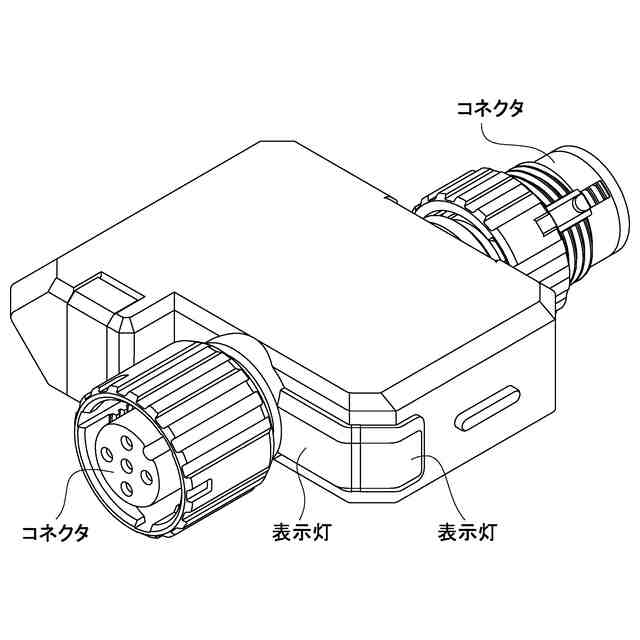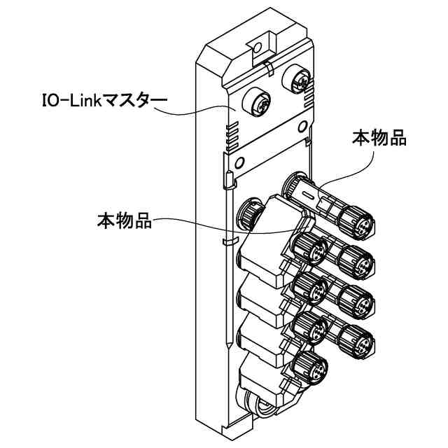 本物品は、センサ等からのアナログ信号をデジタル信号に変換するものであり、このデジタル信号を、例えば、IO-Linkマスター経由で上位機器(プログラマブルコントローラ等)に送信するために使用される。前記センサ等は、使用状態を示す参考図1及び2に示すように、本物品又は本物品を取り付けたケーブルを介してIO-Linkマスターに接続される。本物品は、通電や通信の状態を示す表示灯を備える。