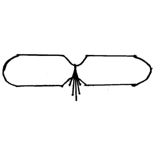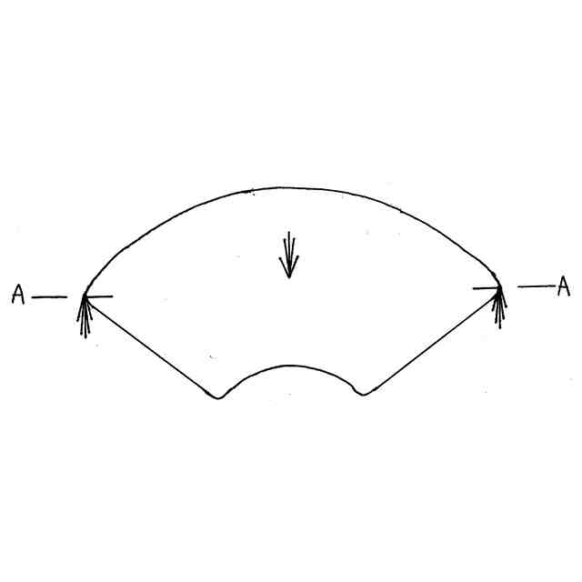 実線で表した部分が、意匠登録を受けようとする部分である。内側・外側の輪郭が弧となる、扇形を模した物品である。底面図は平面図と、左側面図は右側面図と対称につき、底面図と左側面図を省略した。