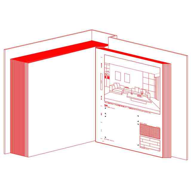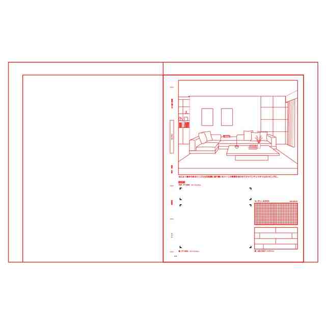 本願意匠に係る見本帳には、[開いた状態の正面図]に示すように、商品見本(壁装材等)を貼り付ける領域の四隅にフレームが設けられている。