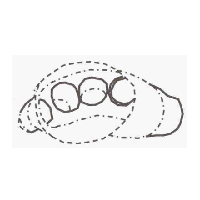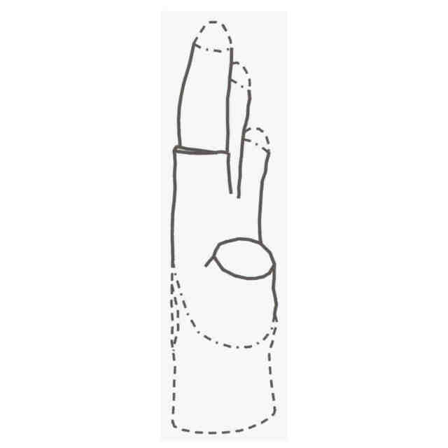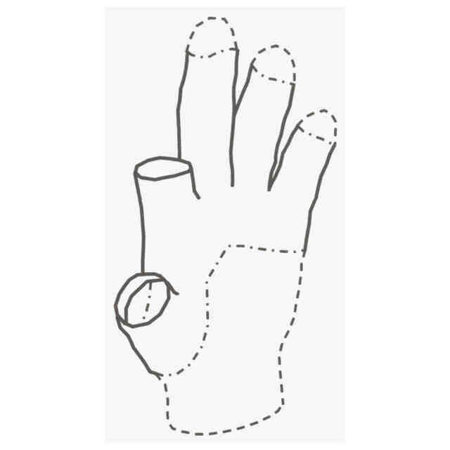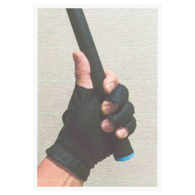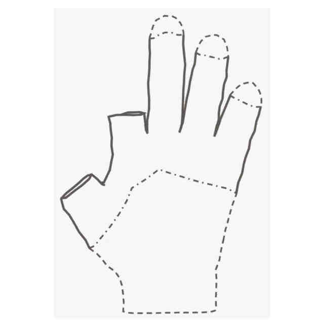 本物品は「使用状態参考図1」及び「使用状態参考図2」に示すように、右利きの人がゴルフクラブを握るときに特にグリップが必要な左手の小指、薬指、中指は指先の関節までが覆われていて、右手との一体感が必要な左手の人差し指と親指は指のつけ根の関節までだけが覆われていて指先までが覆われていないことを特長とするゴルフ用手袋である。
