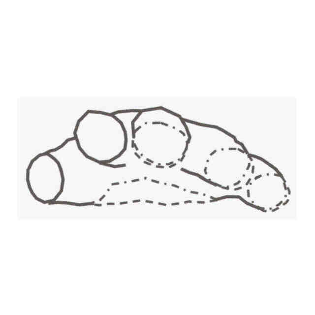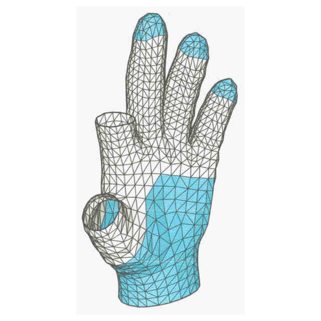 実線で表した部分が、意匠登録を受けようとする部分を特定している。一点鎖線は意匠登録を受けようとする部分とその他の部分との境界のみを示す線である。「形状を示す参考図」においてメッシュ状の細線は、手袋に手を入れたときに変化する布地表面の立体起伏形状の一例を表現している。着色されていない部分が、意匠登録を受けようとする部分である。