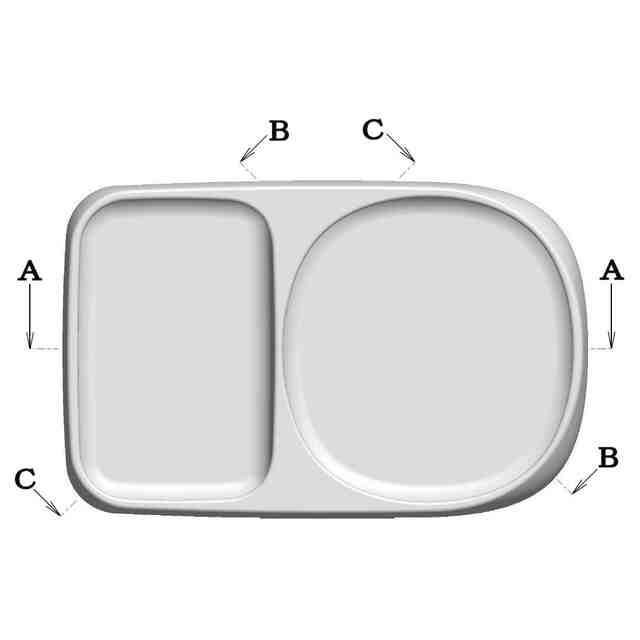 本物品は、主として幼児が食卓で使用する飲食用容器であり、各収容部の四隅に位置する上縁部が、B-B線断面図やC-C線断面図に示すように特に内側に向かって反り返っており、スプーン等で食べ物がすくいやすくなっている。