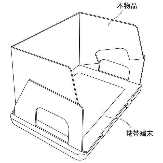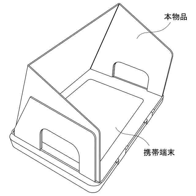 本物品は、例えば、タブレット等の携帯端末の保護や、屋外でディスプレイが見やすくなるように日除けとして用いられるもので、フレーム部分を携帯端末のディスプレイがある面に重ねたうえで、ベルトで固定して使用する。使用状態を示す参考図に示すようにシェード部分の角度は調節可能で、使用しないときは折り畳むこともできる。