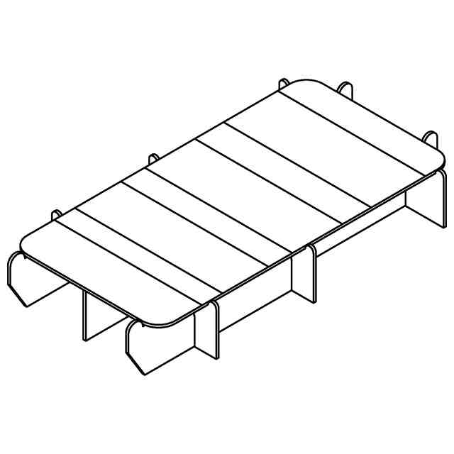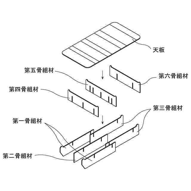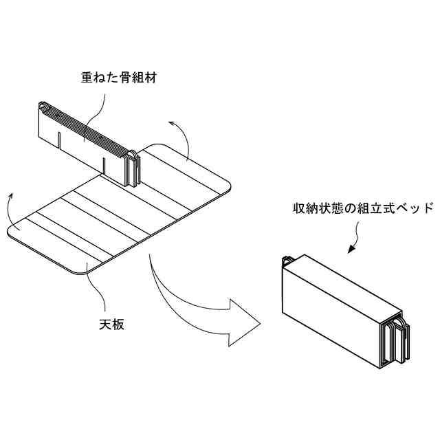本物品は、天板と、骨組材とからなる組立式ベッドである。骨組材は、2つの第一骨組材、1つの第二骨組材、2つの第三骨組材、1つの第四骨組材、1つの第五骨組材及び1つの第六骨組材を備える。本物品は、「組立方法を示す参考図」に示すように、各骨組材をスリットで係合させた後に、天板を配することで組み立てることができる。また、天板は、「天板を折り畳んだ状態の斜視図」に示すように、折り畳むことで略中空四角柱状にすることができ、「収納方法を示す参考図」に示すように、重ねた骨組材を束ねる用途で使用することもできる。これにより、本物品をベッドとして使用しない場合には、組立式ベッドを収納しやすいコンパクトな状態(収納状態)にして、保管することができる。