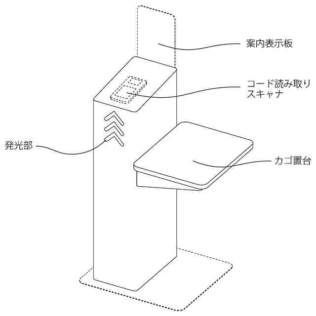 本物品は量販店等のセルフレジ決済後に使用される防犯ゲートである。本物品は、例えば会計後のレシート等に印字されたバーコードをスキャナに読み取らせ、「各部名称を示す参考斜視図」で記載の発光部の光で顧客に通過可否を知らせ、防犯ゲートを顧客が通過できるようにするものである。