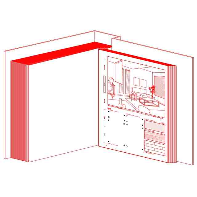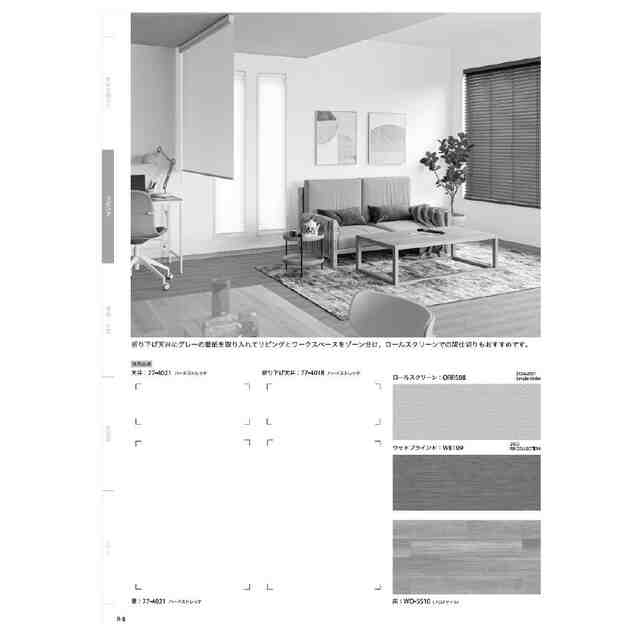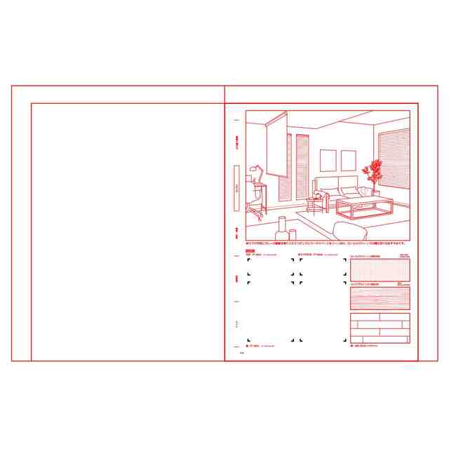 本願意匠に係る見本帳には、[開いた状態の正面図]に示すように、商品見本(壁装材等)を貼り付ける領域の四隅にフレームが設けられている。