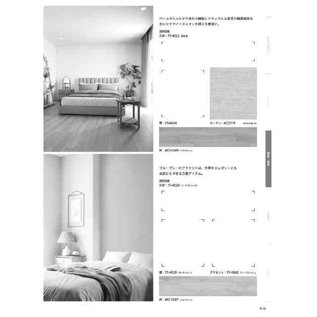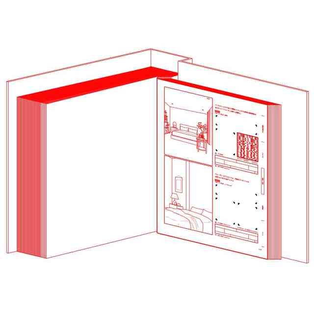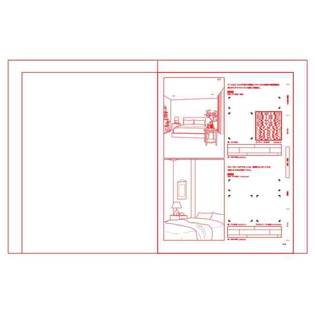 本願意匠に係る見本帳には、[開いた状態の正面図]に示すように、商品見本(壁装材等)を貼り付ける領域の四隅にフレームが設けられている。