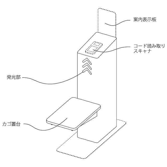 本物品は量販店等のセルフレジ決済後に使用される防犯ゲートである。本物品は、例えば会計後のレシート等に印字されたバーコードをスキャナに読み取らせ、「各部名称を示す参考斜視図」で記載の発光部の光で顧客に通過可否を知らせ、防犯ゲートを顧客が通過できるようにするものである。