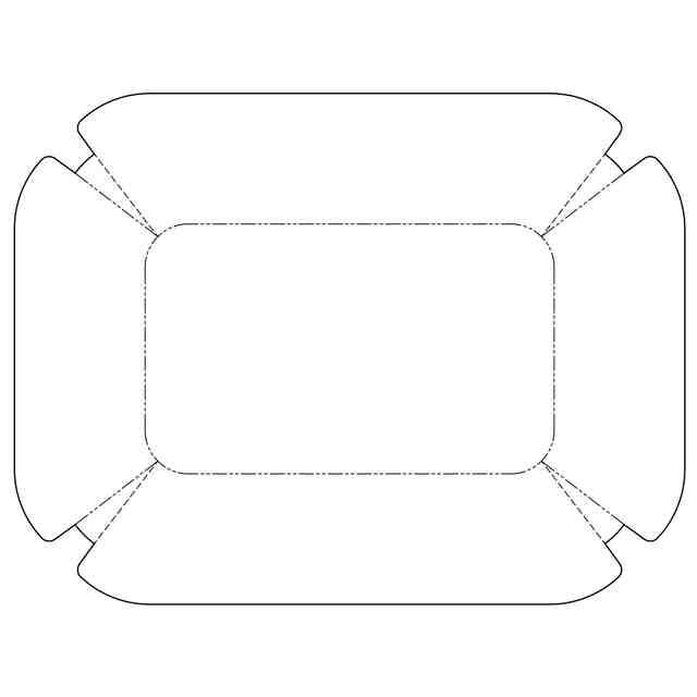 この物品は、参考展開図に示すシート状のブランクがプレス機によって成形されることによって形成される包装用容器である。参考展開図に示したブランクが破線において山折りで、二点鎖線において谷折りで折り曲げられつつ、ブランクが成形時に押圧されながら加熱されることによって、ブランクの表面に設けられた合成樹脂コーティング層が溶融し、ブランクが圧着されて包装用容器としての形状が保持される。さらに、ブランクの外縁が縁巻き加工されて、容器の縁部において、断面が略円形状である縁巻き部分が形成されることによって、全体的に強度が向上して容器の形状が安定的に保持される。
