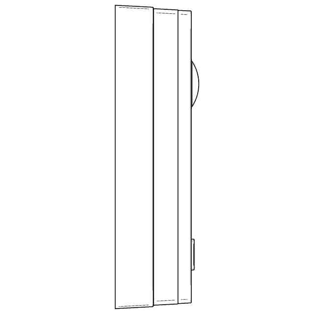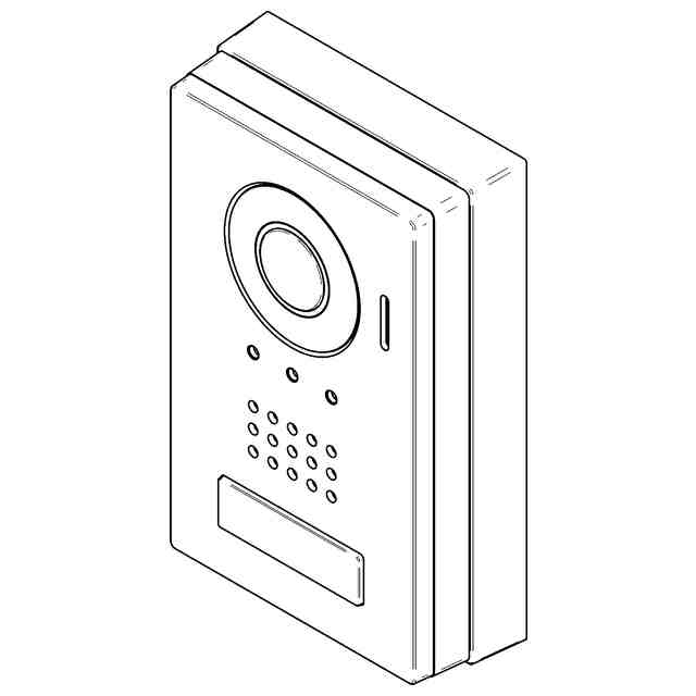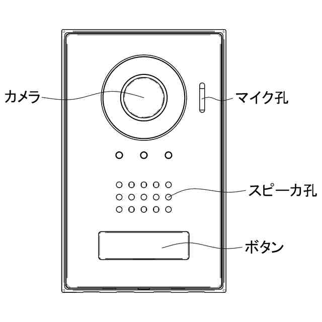 本物品は、玄関子機として使用される略直方体形状のインターホンである。本物品には、各部の名称を示す参考正面図に示すように、正面上部から下部にかけて、カメラと、スピーカ孔と、ボタンとが縦に並んで設けられると共に、カメラの右側にマイク孔が設けられている。