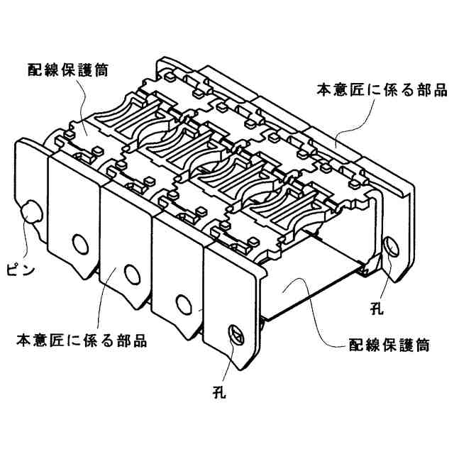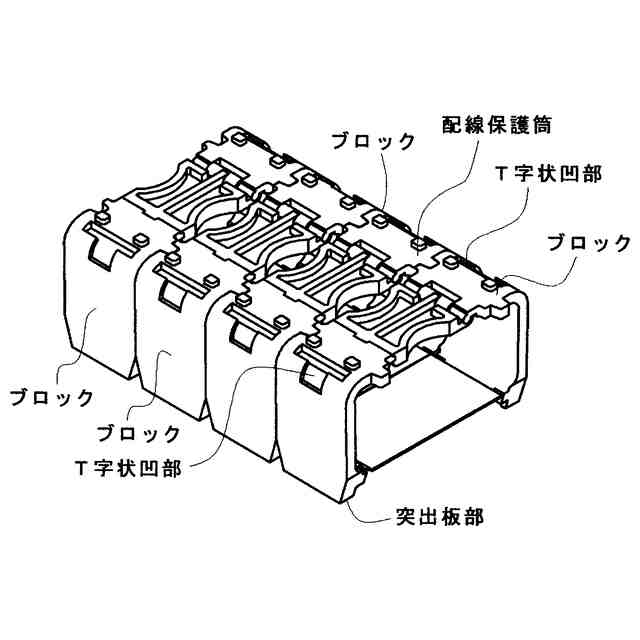 本意匠に係る物品は、機械本体上を往復移動自在な可動部を設けた主に工作機械において、機械本体と可動部の間で電力、信号、エアーや油等の液体を供給したり伝達する配線や配菅を挿通して保護する、複数のブロックを連結して形成した配線保護筒の各ブロックの側面に配線筒部の往復運動を、より円滑にガイドにするためのアタッチメントであり、使用状態を示す参考図に示す様に、各ブロックの両側部下部にある突出部が、本意匠に係る物品の下部に表した溝内に、各ブロックの両側上部にあるT字状凹部内に、本意匠に係る物品の上部に表したT字部が夫々嵌まり込む様にして取り付けられその背面に配線保護筒の可動をより円滑にガイドすることを可能にしたものである。