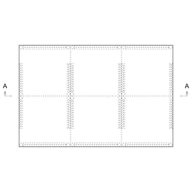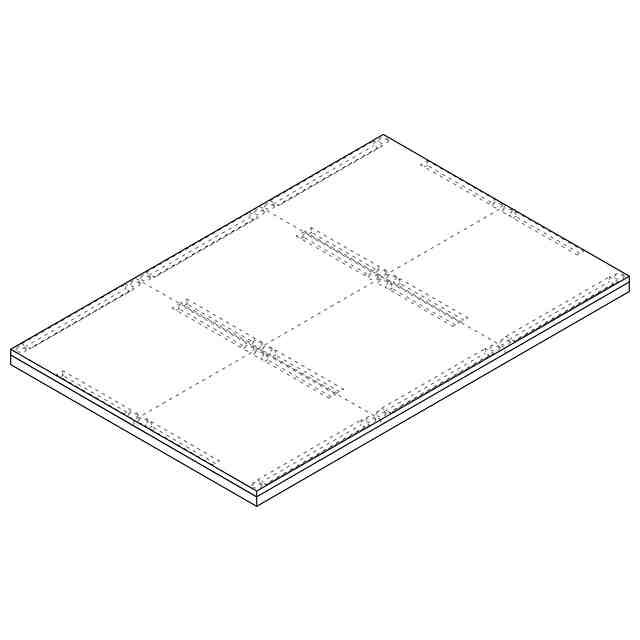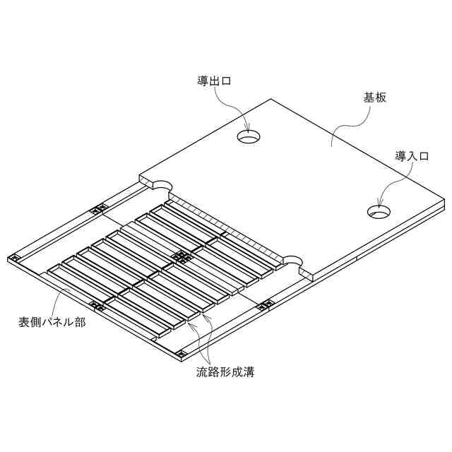 本願意匠に係る物品は、冷暖房が行われる部屋の床に設置される冷暖房用輻射パネルであって、本物品の大きさは、正面図において長辺方向が約900mm、短辺方向が約600mmである。本物品は表側パネル部および基板により構成される。「使用状態を示す参考図」に示すとおり、本物品を複数配列し、その上面に床下地材及び床仕上げ材を設置して使用される。「各部の名称を示す参考図」に示すとおり、温度調節済み空気を基板に設けられた導入口から導出口に向けて流路形成溝に流すことで、冷熱又は温熱の輻射によって室内の冷暖房を行うことができる。