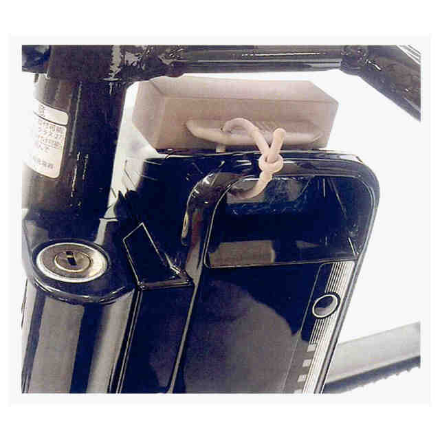 電動アシスト自転車 主要メーカー車のバッテリー充電器 及び 車体側の充電端子に対応できる形状とした。 また走行時に落下しないようフレーム等に固定できるストラップをつけた。