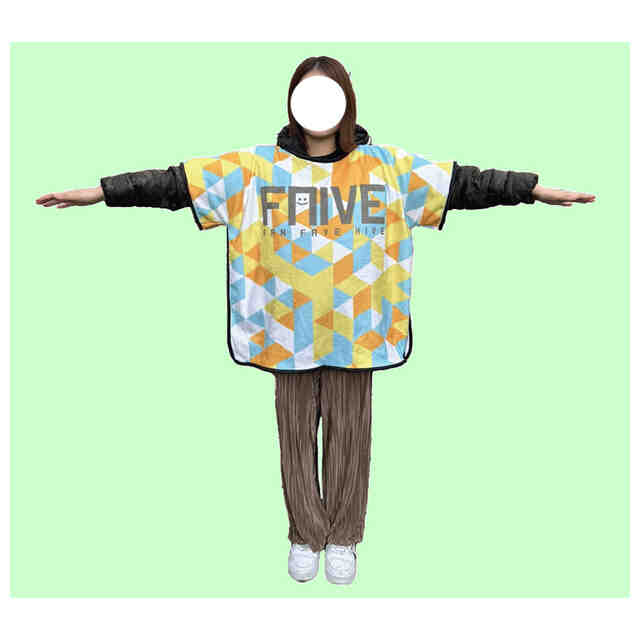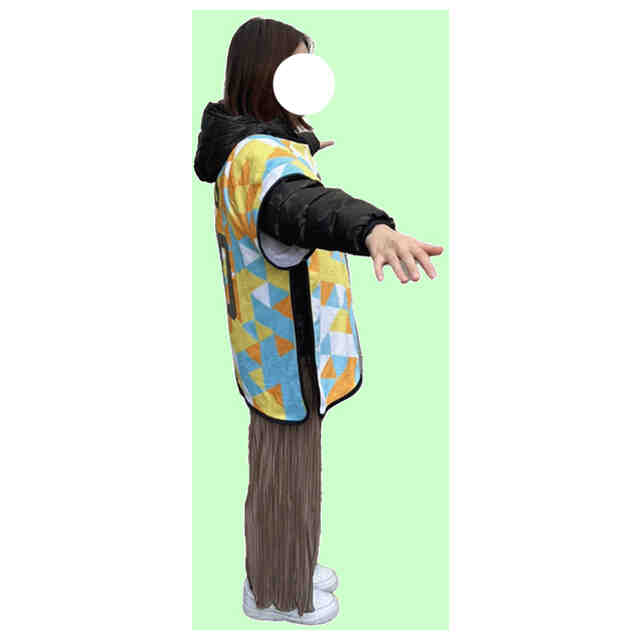 本物品は、「使用状態を示す参考正面図」及び「使用状態を示す参考側面図」に示すように、衣服等の上から着用するポンチョである。このポンチョは、「表側から見た参考展開図」及び「裏側から見た参考展開図」に示すように、中央に穴(この穴は、頭を通す部分として使用される。)が開いた生地(本体生地)から作られる。例えば、[1]「表側から見た参考展開図」に示す状態から、本体生地を、一点鎖線P1-P8を折り目として、紙面手前側(本体生地の表面が内向きとなる向き)に折り返し、袖下となる部分(後身頃側の本体生地における線分P2-P3に沿う箇所と前身頃側の本体生地における線分P14-P13に沿う箇所、及び、後身頃側の本体生地における線分P6-P7に沿う箇所と前身頃側の本体生地における線分P10-P9に沿う箇所)とを重ね、[2]本体生地を左右の袖下に沿った箇所で縫着(後身頃側の本体生地における線分P2-P3に沿う箇所と、前身頃側の本体生地における線分P14-P13に沿う箇所とを縫着するとともに、後身頃側の本体生地における線分P6-P7に沿う箇所と、前身頃側の本体生地における線分P10-P9に沿う箇所とを縫着)した後、[3]本体生地の表と裏をひっくり返す(本体生地の表面が外向きとなり、裏面が内側となるようにひっくり返す)ことによって作られる。すると、「正面図」、「背面図」、「左側面図」、「右側面図」、「平面図」及び「底面図」に示したポンチョが得られる。ポンチョの本体生地は、連続した1枚のものを用いてもよいし、複数枚の生地を繋ぎ合わせたもの(例えば、前身頃側の生地と、後身頃側の生地とを両肩上のラインに沿ってつなぎ合わせたもの等)を用いてもよい。このポンチョは、正面視「T」字状(Tシャツのような形態)を為しており、両袖を有するところ、上述したように、袖下に沿った箇所が縫着されているため、袖口が、閉じた環状を為している。一方、両脇よりも下側の端縁に沿った箇所が縫着されていない(後身頃側の本体生地における点P3と点P4と点P5と点P6とを結ぶ線に沿った箇所と、前身頃側の本体生地における点P13と点P12と点P11と点P10とを結ぶ線に沿った箇所とが縫着されていない)ため、両脇よりも下側の端縁に沿った箇所が開放されている。「使用状態を示す参考側面図」からも、ポンチョの袖口が閉じた環状となっていることや、両脇よりも下側の部分が開放されていることが分かる。このため、「使用状態を示す参考正面図」に示すように、ダウンジャケット等の外套の上側にもポンチョを容易に着用できるだけでなく、腕を袖に通して着用するため、ポンチョの両肩付近がめくれないようにすることができる。本物品のポンチョは、上記のような形態を有しているため、例えば、「使用状態を示す参考正面図」に示すような柄をプリントすれば、各種スポーツチームのユニフォームのように見せることもできる。前身頃の外面に、チーム名やエンブレム等をプリントしたり、後身頃の外面に、選手名や背番号等をプリントすることで、ポンチョをよりユニフォームに似せて見せることができる。