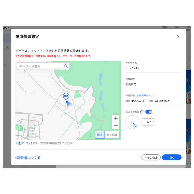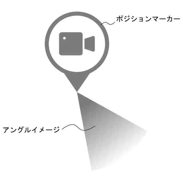 本組物の画像は、通信ネットワークに接続された遠隔カメラの位置および向きを把握するための画面に用いられるものである。本組物の画像は、画像Aと画像Bからなる。画像Aは、操作により変化する画像であって、現在の向きを示すためのポインターと、ポインターの向きの直感的な理解を助けるためのアングルイメージとを有する(両者を併せて「向き表示部」という。)。画像Aの向き表示部は、時計回り(画像図Aの図1→図2→図3→図4→図5→図1)、反時計回り(画像図Aの図1→図5→図4→図3→図2→図1)のいずれの方向にも回動可能である。画像Aの操作は、向き表示部およびその近傍の領域を、例えばドラッグなどして、回動させることにより行う。他方、画像Bは、地図上や航空写真上などに配置され操作により移動させることが可能な画像であるとともに、画像Aの操作により変化する画像であって、カメラの位置を示すためのポジションマーカーと、カメラのおおよその向きを直感的に示すためのアングルイメージとを有する。画像Bのアングルイメージは、時計回り(画像図Bの図1→図2→図3→図4→図5→図1)、反時計回り(画像図Bの図1→図5→図4→図3→図2→図1)のいずれの方向にも回動可能である。画像Aを操作してその向き表示部を回動させると、画像Bのアングルイメージも連動して回動する。画像Aの向き表示部の方向と画像Bのアングルイメージの方向は一致しており、画像Aの向き表示部を画像Aの図1、図2、図3、図4、図5の状態にセットすると、画像Bのアングルイメージは画像Bの図1、図2、図3、図4、図5の状態にそれぞれセットされる。以下、実施態様の一例を示す参考図を用いながら、具体的に説明する。画像Bは地図上に配置されており、ドラッグ操作により地図上を自在に移動可能である。画像Bを操作して移動させ、ポジションマーカーを実際に遠隔カメラが設置されている場所にセットする。その後、画像Aを操作してそのポインターの向きを実際のカメラの向き(参考図では144°)に合わせると、画像Bのアングルイメージもその方向を向く。これにより、地図上の画像Bの状況を見ることで、通信ネットワークに接続された遠隔カメラの実際の位置および向きを把握することができる。