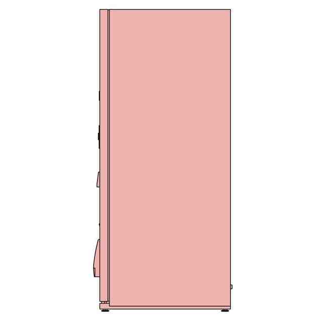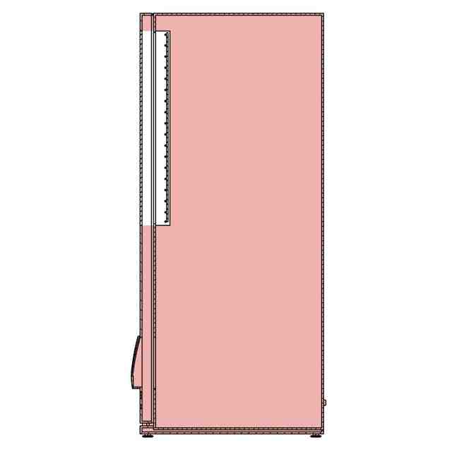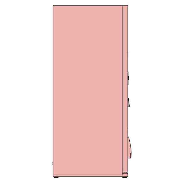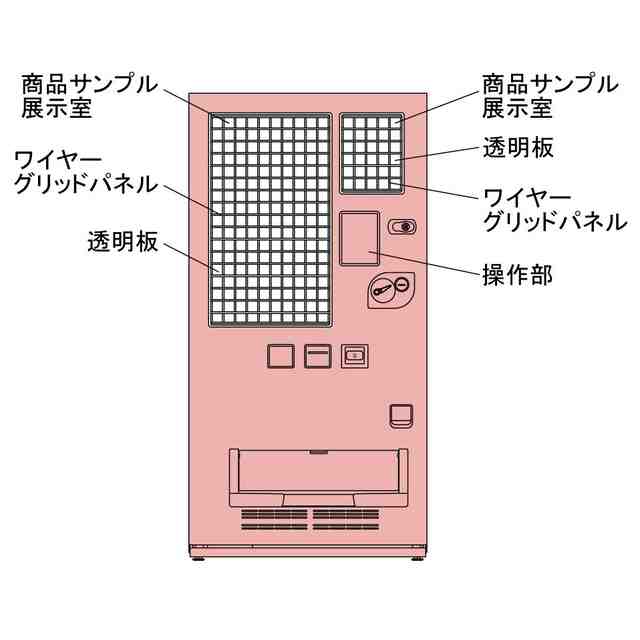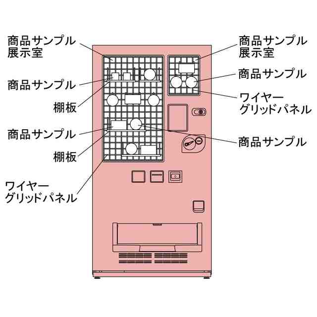 本物品は、主に冷蔵商品や常温商品を販売する自動販売機である。正面には透明板を介して内部が視認可能な大小二つの商品サンプル展示室が設けられ、各商品サンプル展示室内の奥にはワイヤーグリッドパネルが取り付けられている。商品サンプル展示室では、使用状態を示す参考正面図に示すように、吊り下げフックなどによってワイヤーグリッドパネルに取り付けられた棚板上に商品サンプルを載置し、及び/又はワイヤーグリッドパネルに取り付けられたフックに商品サンプルを吊るすことが可能である。商品の選択は、タッチパネル式の操作部に表示された商品選択ボタンに触れることによって行われる。