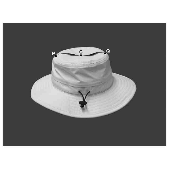 本物品は、着用者の頭部を覆うためのクラウンと、クラウンの下端縁全周部から突出して設けられたプリム(鍔)とで構成されたハット型の帽子である。クラウンは、平面視円形状を為すトップクラウン(クラウン上部)と、円筒状を為すサイドクラウン(クラウン側部)とで構成されている。本物品の帽子では、「平面図」に示されるように、トップクラウンを構成する生地が、クラウン前側(前側生地)とクラウン後側(後側生地)とで分離している。「後方斜め上から見た参考図」に示すように、トップクラウンの前側生地と後側生地とは、その両端部の点P,Q近傍と、その中間部の点C近傍とでは互いに縫着されているものの、点Pと点Cとの間の区間PCや、点Qと点Cとの間の区間QCは、互いに縫着されていない。このため、トップクラウンにおける区間PC及び区間QCにスリットが形成された状態となっている。このスリットを通じて、クラウン内外のベンチレーションを行うことができる。「平面図」において、トップクランの前側生地と後側生地との境界線(同図において黒い線状に表れた部分)が、トップクラウンの前後方向中間に位置しているのに対し、「底面図」において、トップクランの前側生地と後側生地との境界線(同図において白い線状に表れた部分)が、トップクラウンの前後方向中間よりも前側(同図の紙面に向かって上側)に位置していることからも分かるように、前側生地と後側生地とは、その境界近傍において、帯状の重なり部分が設けられている。すなわち、前側生地の後端縁に沿った箇所が、後側生地の前端縁に沿った箇所の上側(オモテ面側)に重なっている。この重なり部分によって、着用者の頭髪がトップクラウンにおける前記スリットから外部に露出しにくくすることができる。「底面図」において、トップクランの前側生地と後側生地との境界線が白い線状に表れている理由は、前側生地の後端縁に沿った箇所が、線分PQ(「後方斜め上から見た参考図」を参照)を折り線としてトップクラウンのウラ面側に折り返されており、前側生地におけるウラ面側に折り返された部分が「底面図」でも一部表れているからである。