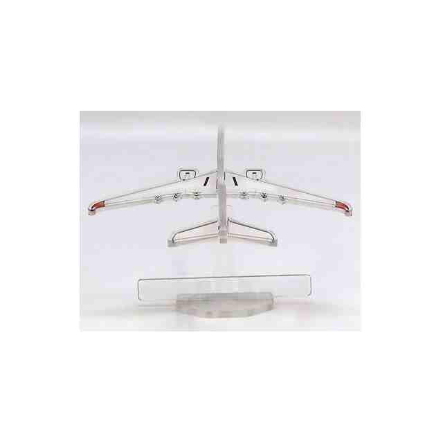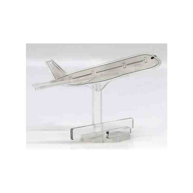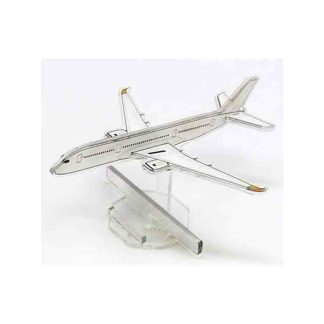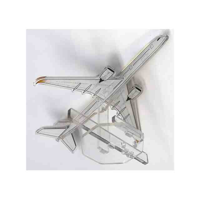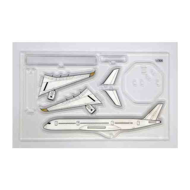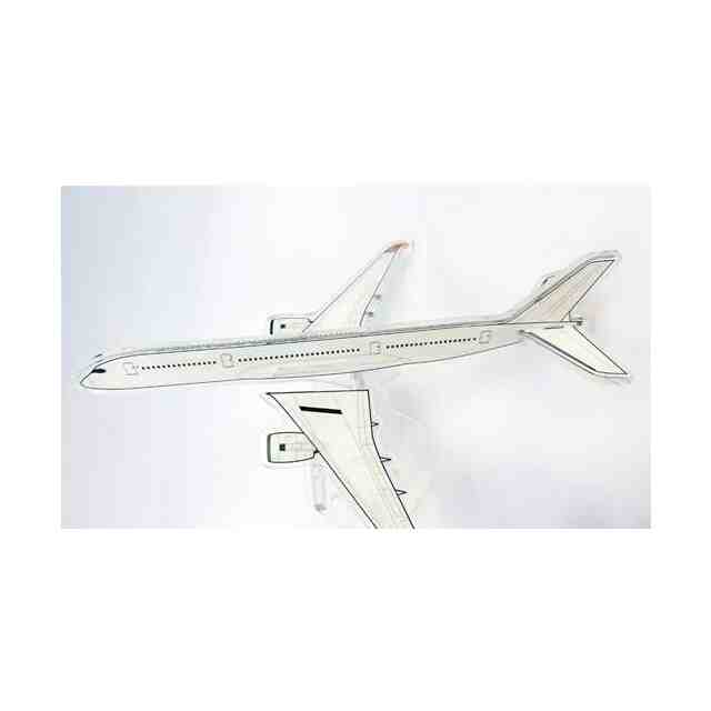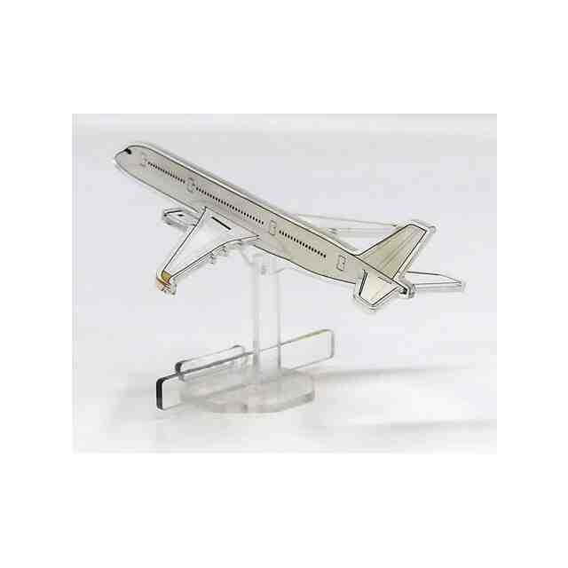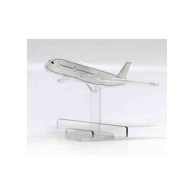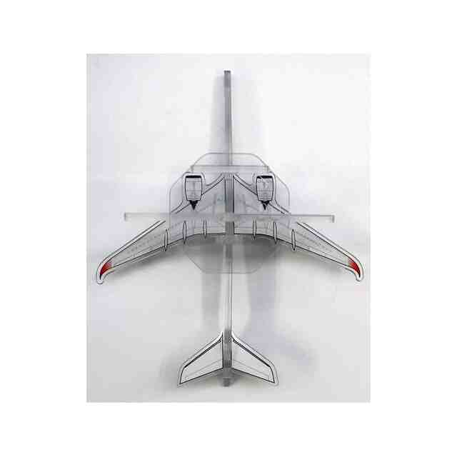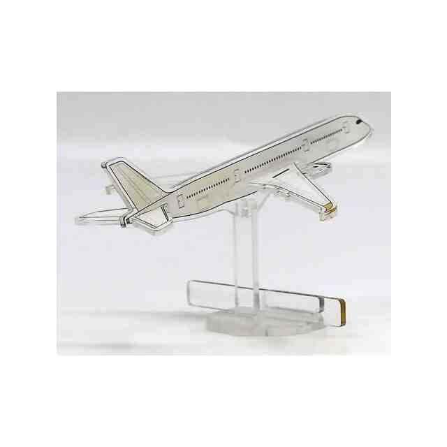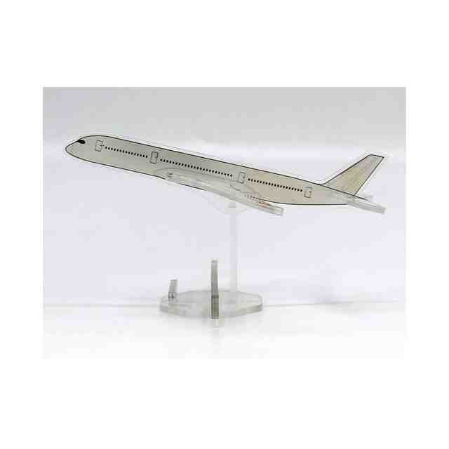 この意匠に係る物品は、透明なアクリル板で各構成片が形成され、各構成片が適切に組み合わされることで飛行機の形状を成す飛行機おもちゃである。特に、各構成片を並べた状態を示す参考図に示されるように、主翼と水平尾翼を胴体へ結合させるために胴体側の部位に設けられた突起部が、左右の主翼および左右の水平尾翼において対向して衝突しないように、ずらして設けられていることから、完成時に、左右の主翼および水平尾翼が、胴体にきちんと接続され、左右対称に見える外観が構成されている点に特徴を有する。さらに、この意匠は、旅客機を想起させる形状を有しているが、アクリル板を特定の形状にくり抜いて各構成片が形成されるため、胴体は円筒形ではなく、アクリル板の厚さを有する板状となっている。板状の各構成片を組み合わせることで、旅客機の形状を表してたところに意匠の創作の中心がある。また、旅客機の飛行姿勢を再現するため、機体の下部にスタンドが連結されている。旅客機の模型およびこれに連結されたスタンドにより、本意匠に係る物品である飛行機おもちゃが構成されている。なお図面中に示されるように、構成片の一部には着色が施されている。材料となっているアクリル板は、透明であるため、着色部分については、見る角度によって色彩が異なって見えることがある。